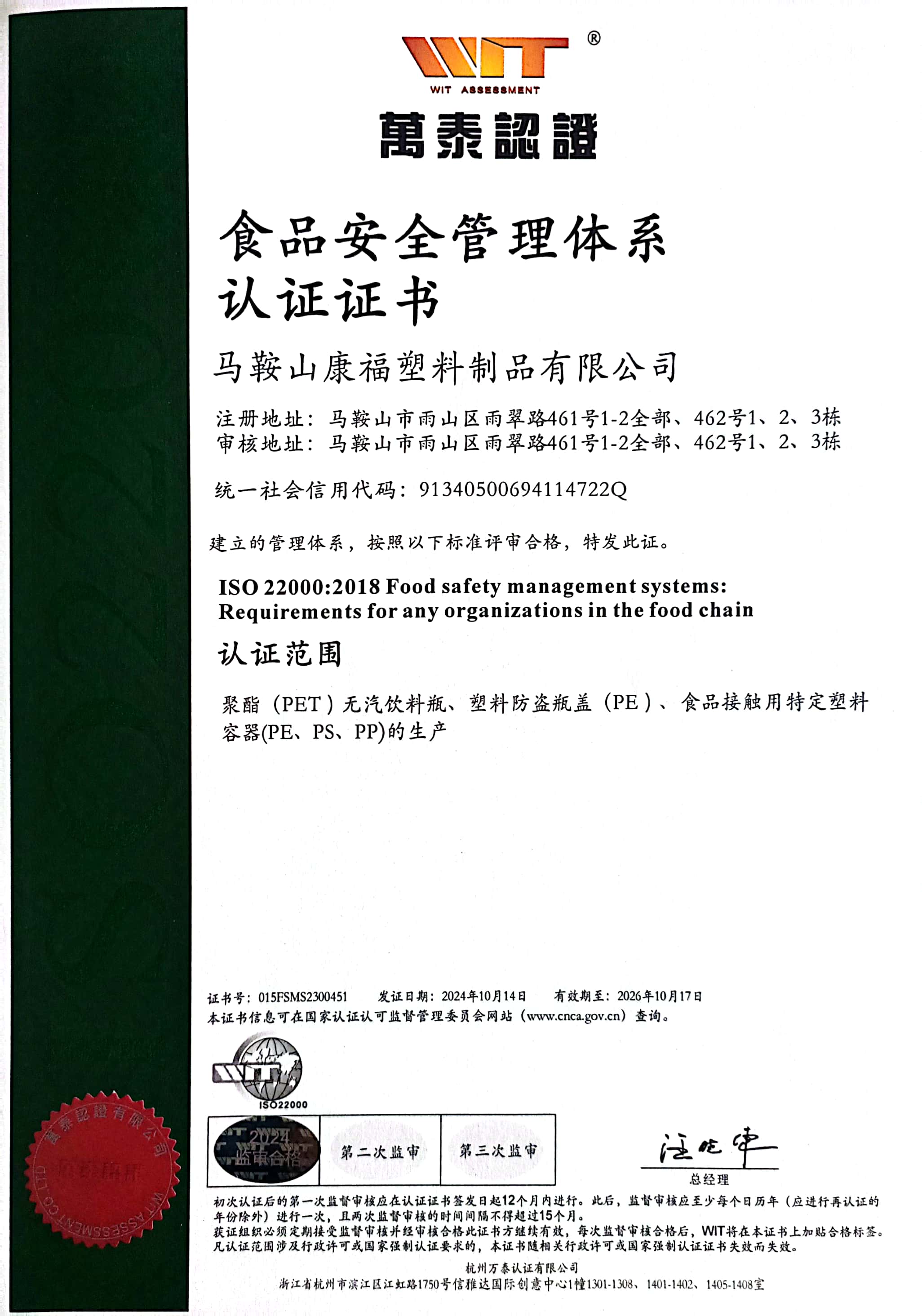 食品安全管理體系認(rèn)證證書